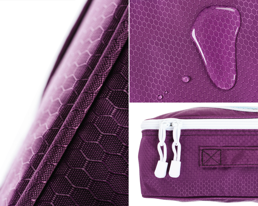- Laundry Bag: 100% Water-resistant 210 Denier Genuine Ripstop Smooth Nylon (Boss Black, Premium Purple); 100% 420 Denier Waterproof Genuine Honeycomb Nylon (Bahama Sky Blue)